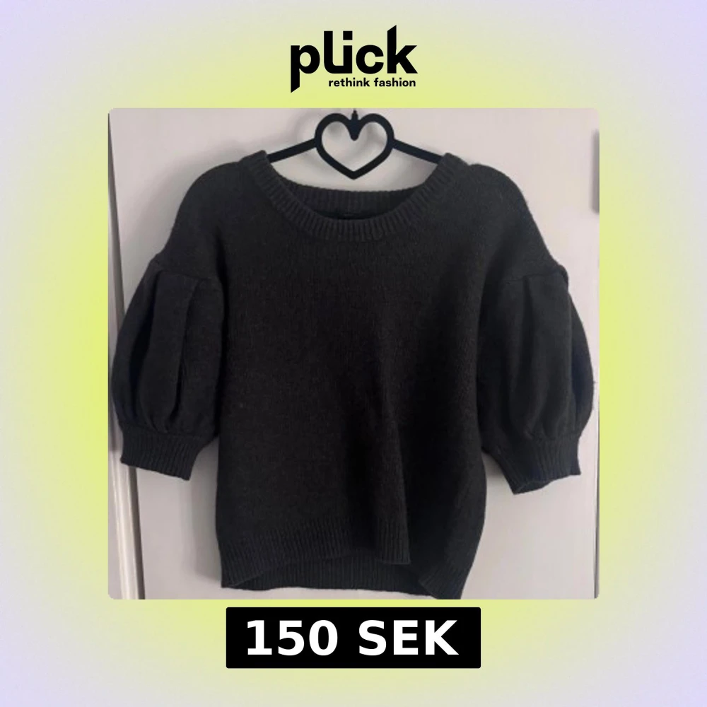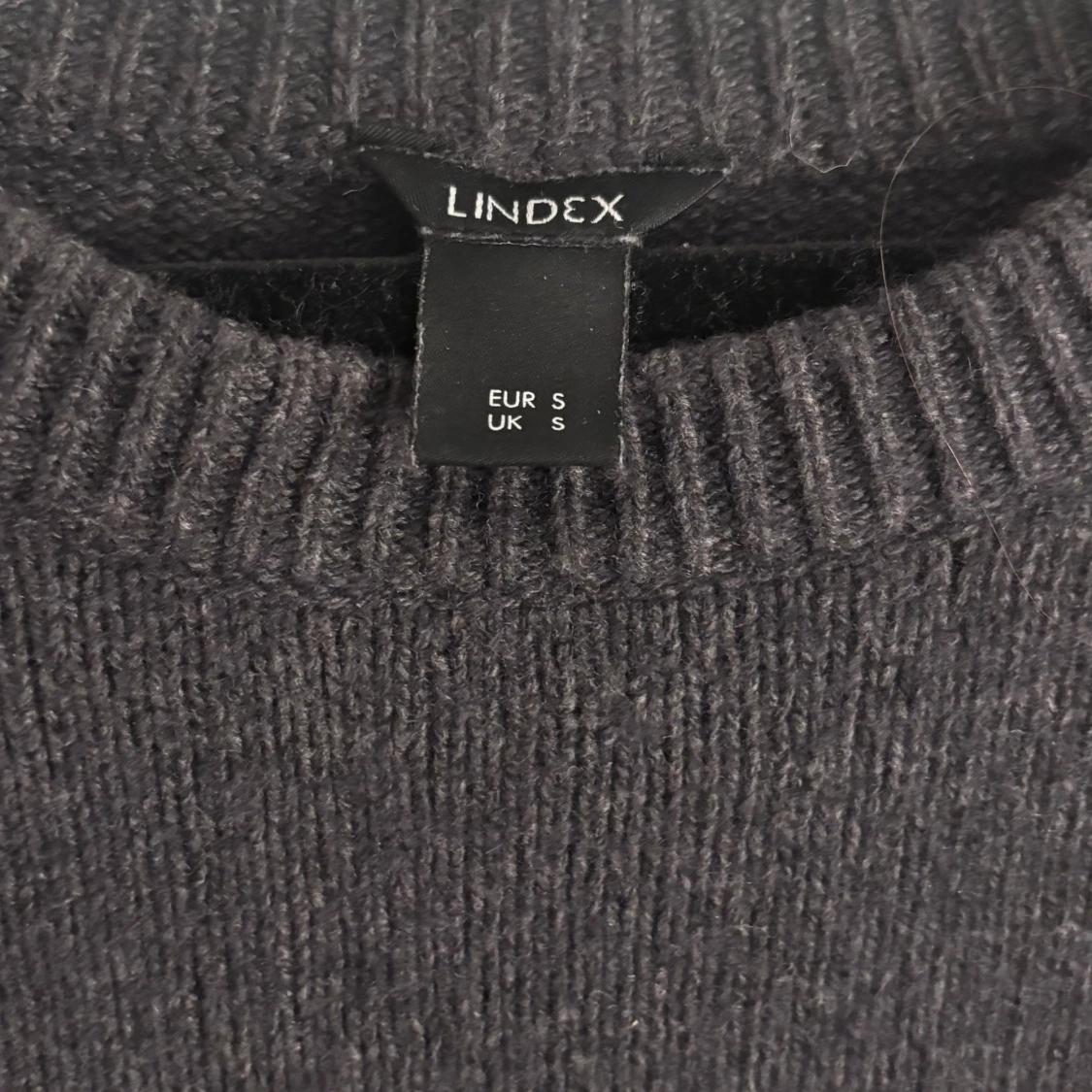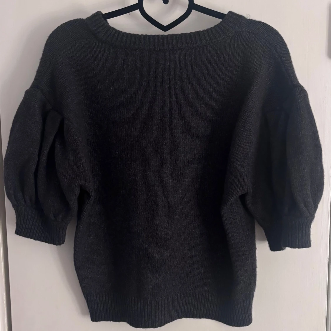 Mysig mörkgrå stickad tröja från Lindex med puffiga trekvartsärmar och bred ribbad kant vid hals, ärmslut och nederkant. Knappt använd, inga skador eller knoppar på tröjan.