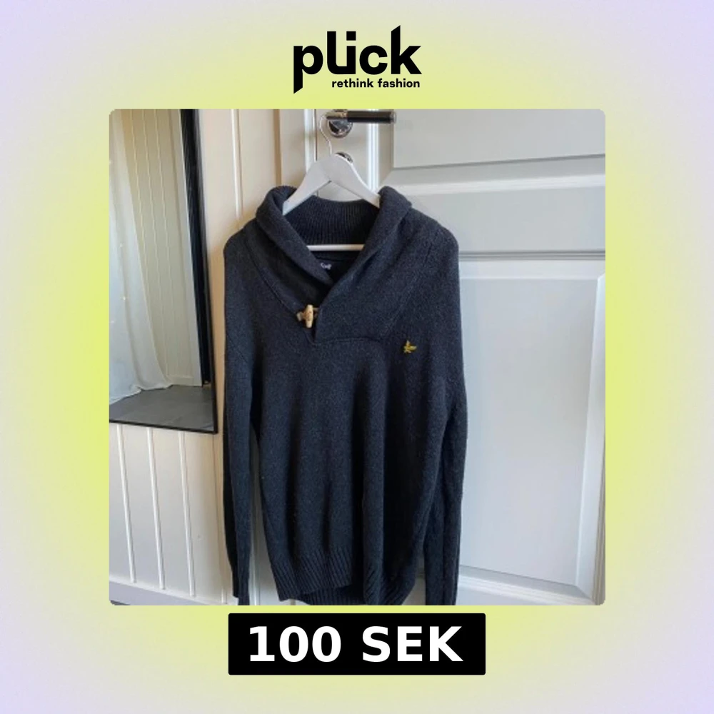 Mörkgrå stickad tröja från Lyle & Scott med snygg träknapp vid halsen och gul logga på bröstet. Tröjan har en bred krage och långa ärmar, perfekt för kyliga dagar. Ribbstickade muddar ger en schysst passform.