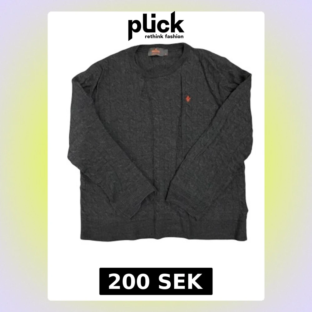 Snygg mörkgrå stickad tröja från Morris med diskret kabelstickat mönster och röd broderad logga på bröstet. Tröjan har rund hals och långa ärmar med ribbade muddar. Perfekt för dig som gillar klassisk stil med en twist. (BVSA!!!)