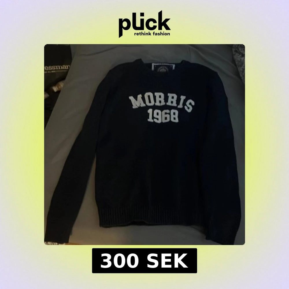 Svart stickad tröja från Morris i storlek Large med vit text 'MORRIS 1968' på bröstet och en snygg patch med Union Jack på ärmen. Tröjan har rund hals, ribbade muddar och är långärmad. Perfekt för dig som gillar klassisk stil med en sportig touch. Storlek large