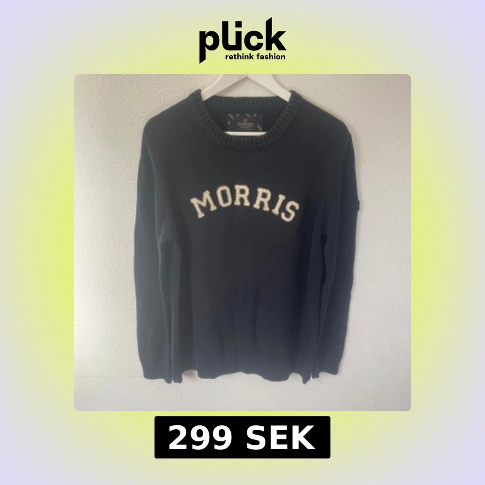 Snygg mörkblå stickad tröja från Morris i storlek Large. Tröjan har krämfärgad MORRIS-text framtill och en patch med brittiska flaggan på ärmen. Rund hals och ribbade muddar vid ärmslut och nederkant. Perfekt för dig som gillar klassisk stil.