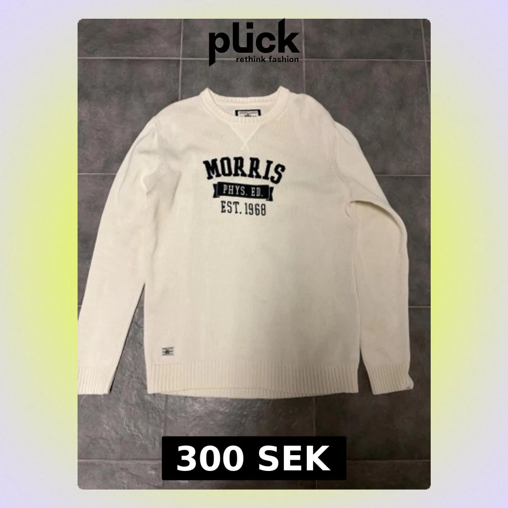 Säljer en vit stickad tröja från Morris med svart text 'MORRIS PHYS. ED. EST. 1968' på bröstet. Tröjan har rund hals, ribbade muddar och är långärmad. Perfekt för dig som gillar klassisk college-stil.