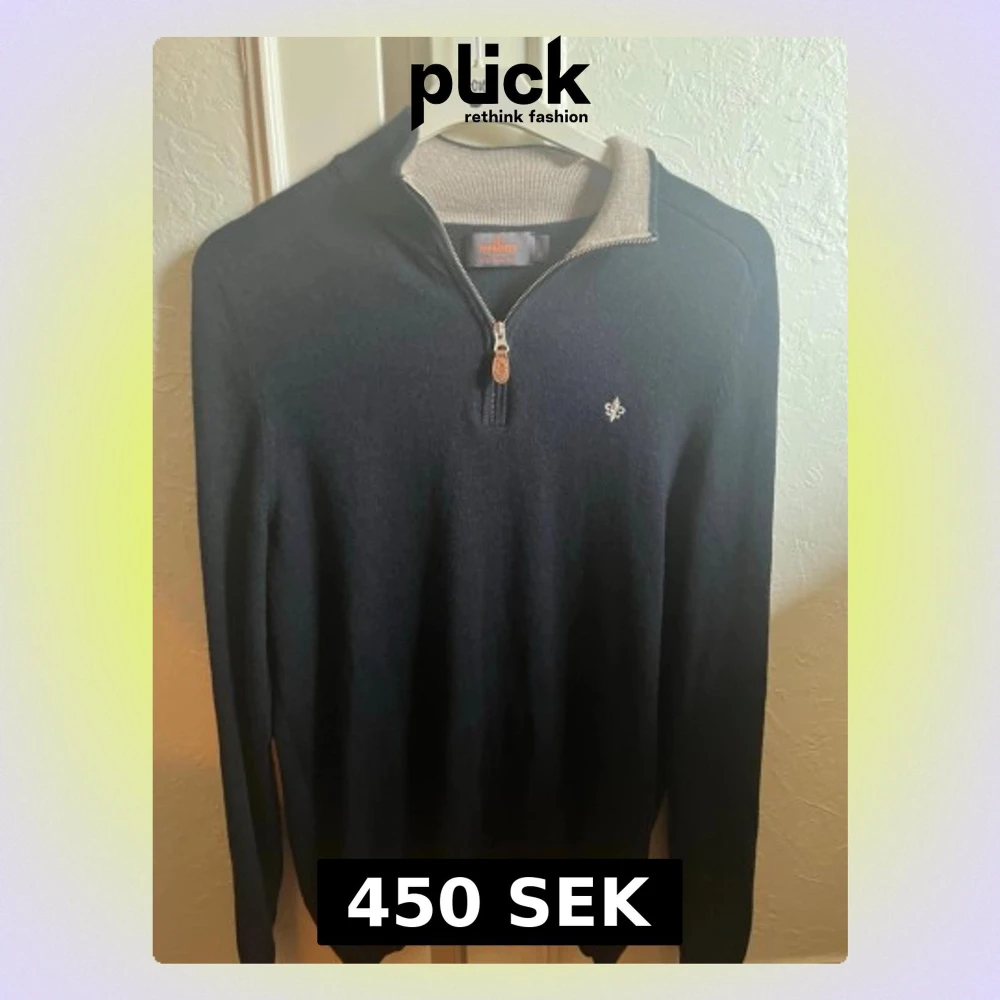 Snygg marinblå stickad tröja från Morris i 100% merinoull. Tröjan har en half zip med läderdetalj och kontrastfärgad krage i beige. Liten broderad logga på bröstet och långa ärmar. Perfekt för dig som gillar klassisk stil.