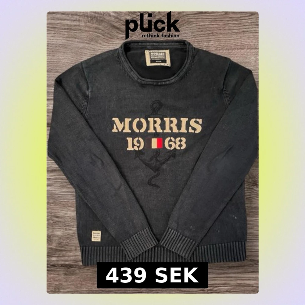 Svart stickad tröja från Morris med beige tryck framtill där det står 'Morris 1968' och en liten flagga i beige, svart och rött. Tröjan har ett diskret ankare i bakgrunden, rund hals och ribbade muddar vid ärmslut och nederkant. Perfekt för dig som gillar klassisk stil.