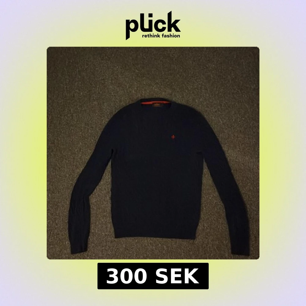 Mörkblå stickad tröja från Morris med klassisk rund hals och diskret röd logga broderad på bröstet. Tröjan har lång ärm och ribbade muddar. Perfekt för dig som gillar stilren och tidlös design. Storlek S