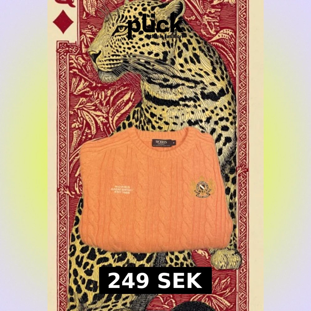 Snygg orange kabelstickad tröja från Morris i storlek M. Tröjan har rund hals, lång ärm och broderad logga på bröstet. Materialet är mjuk bomull och den har ribbade muddar vid hals, ärmslut och nederkant. Perfekt för dig som gillar klassisk stil med en twist.