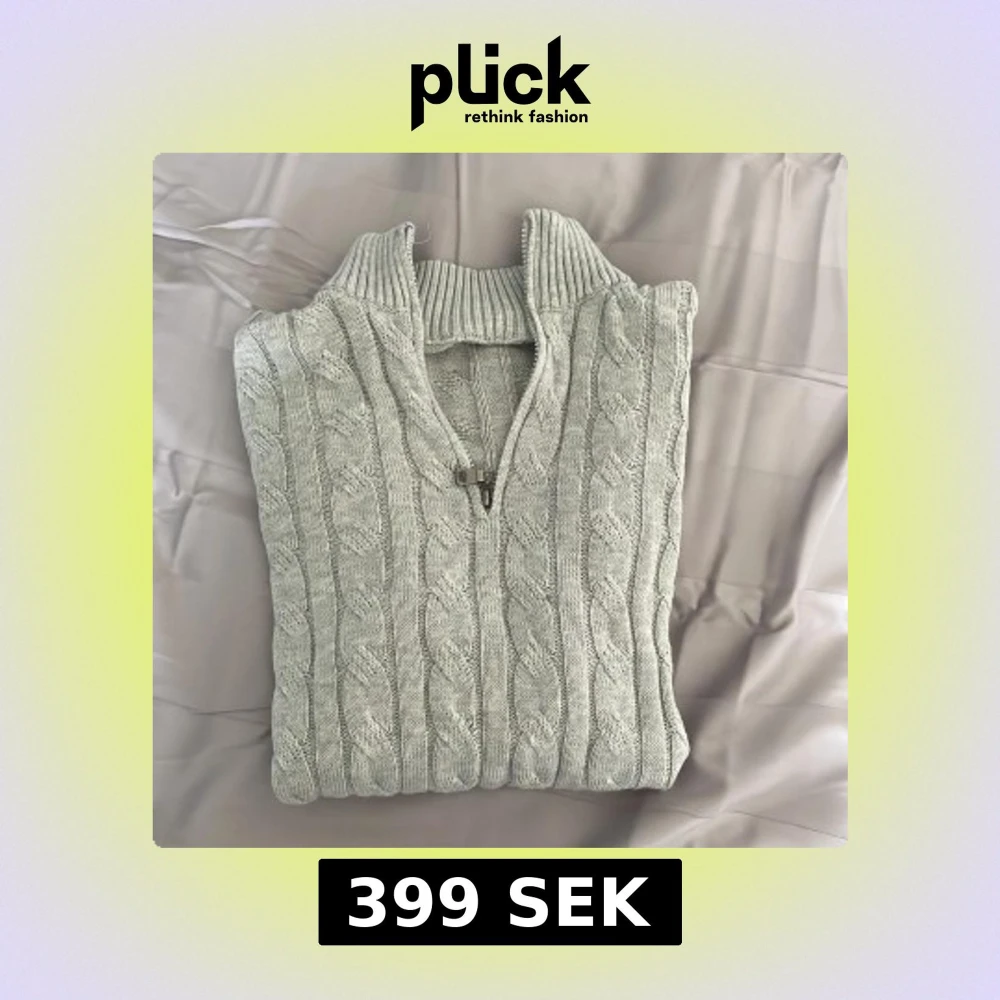 Säljer en HELT NY ljusgrå stickad tröja med kabelstickat mönster och ribbad krage. Tröjan har half zip-dragkedja och långa ärmar, perfekt för kyliga dagar. Snygg och enkel att matcha med jeans eller kjol.