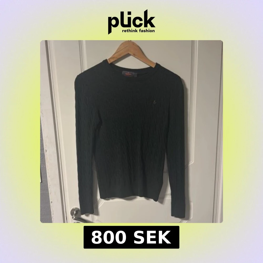 Snygg mörkgrön stickad tröja från Morris i 100% merinoull. Tröjan har ett klassiskt kabelstickat mönster, rund hals och lång ärm. På bröstet finns en broderad logga i beige. Perfekt för dig som gillar stilrena och tidlösa plagg. Köpt i butik, hennings.