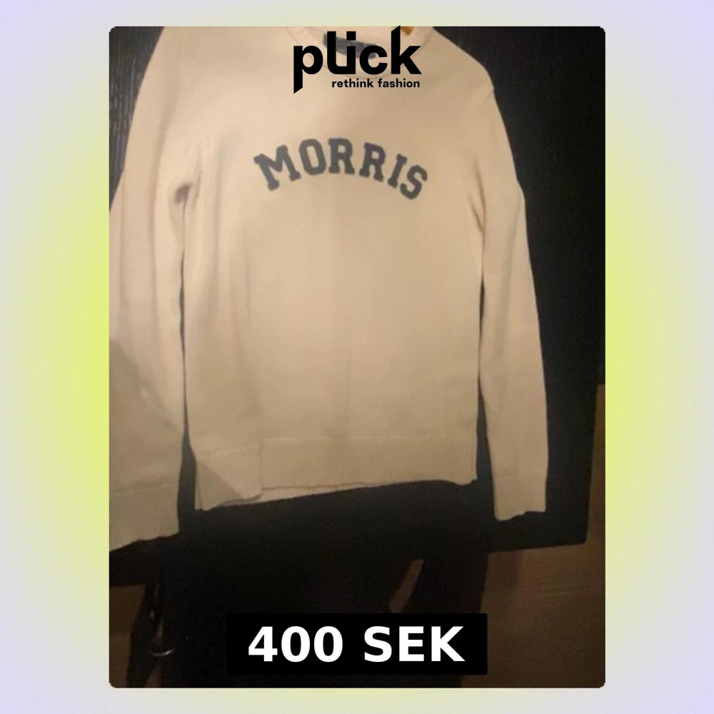 Snygg vit stickad tröja från Morris med mörkblå text framtill. Klassisk rund halsringning och långa ärmar. Perfekt till jeans eller chinos för en clean och stilren look. Den har några defekter på underarmen, som du kan se på bild 5 men de går att ta bort med rengöring, men som sagt så syns de inte mycket eftersom de är på underarmen