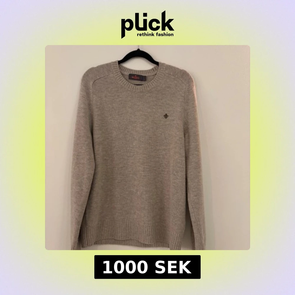 Beige stickad tröja från Morris med rund halsringning och diskret logga broderad på bröstet. Tröjan har ribbade muddar vid ärmslut och nederkant, och är perfekt för lager-på-lager under kyliga dagar. Den är använd 1 gång. Nypris 1899