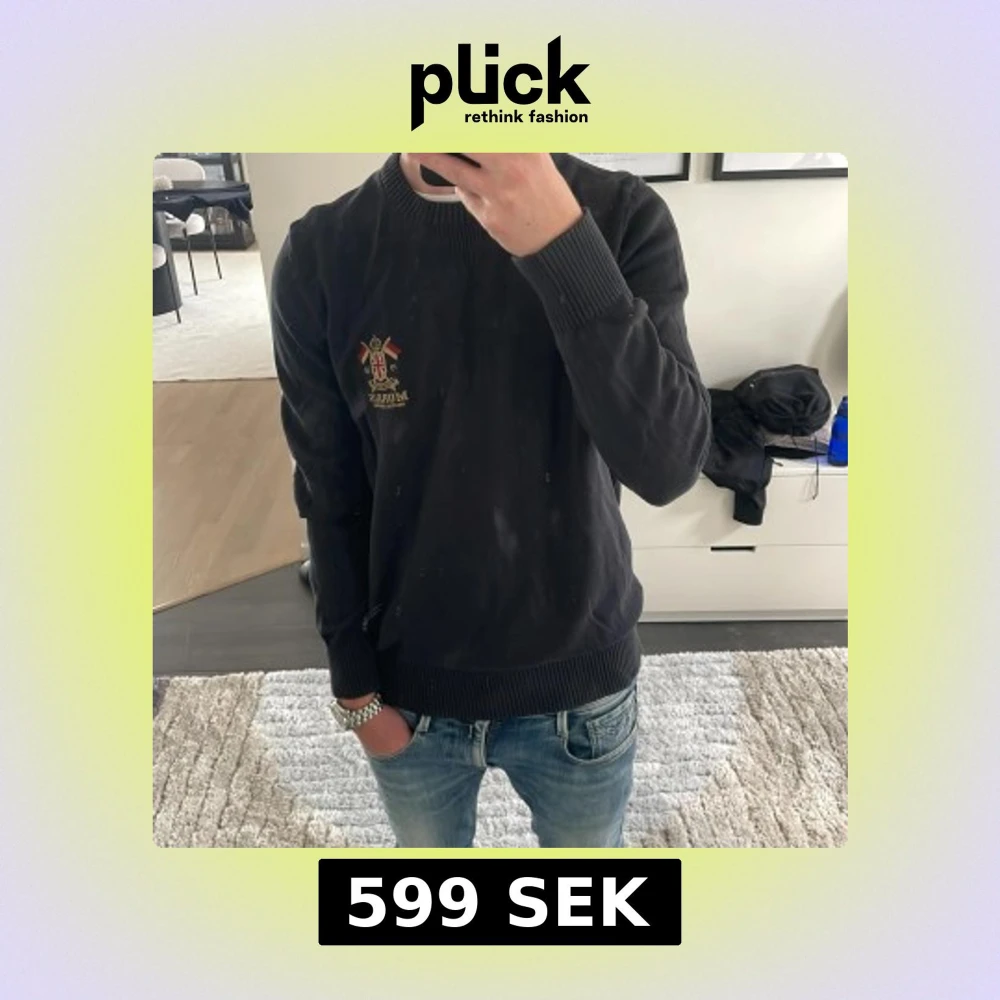 Snygg svart stickad tröja frpn Morris. Perfekt nu inför lite kallare tider. Modellen är ca 180cm. Hör av dig vid funderingar!