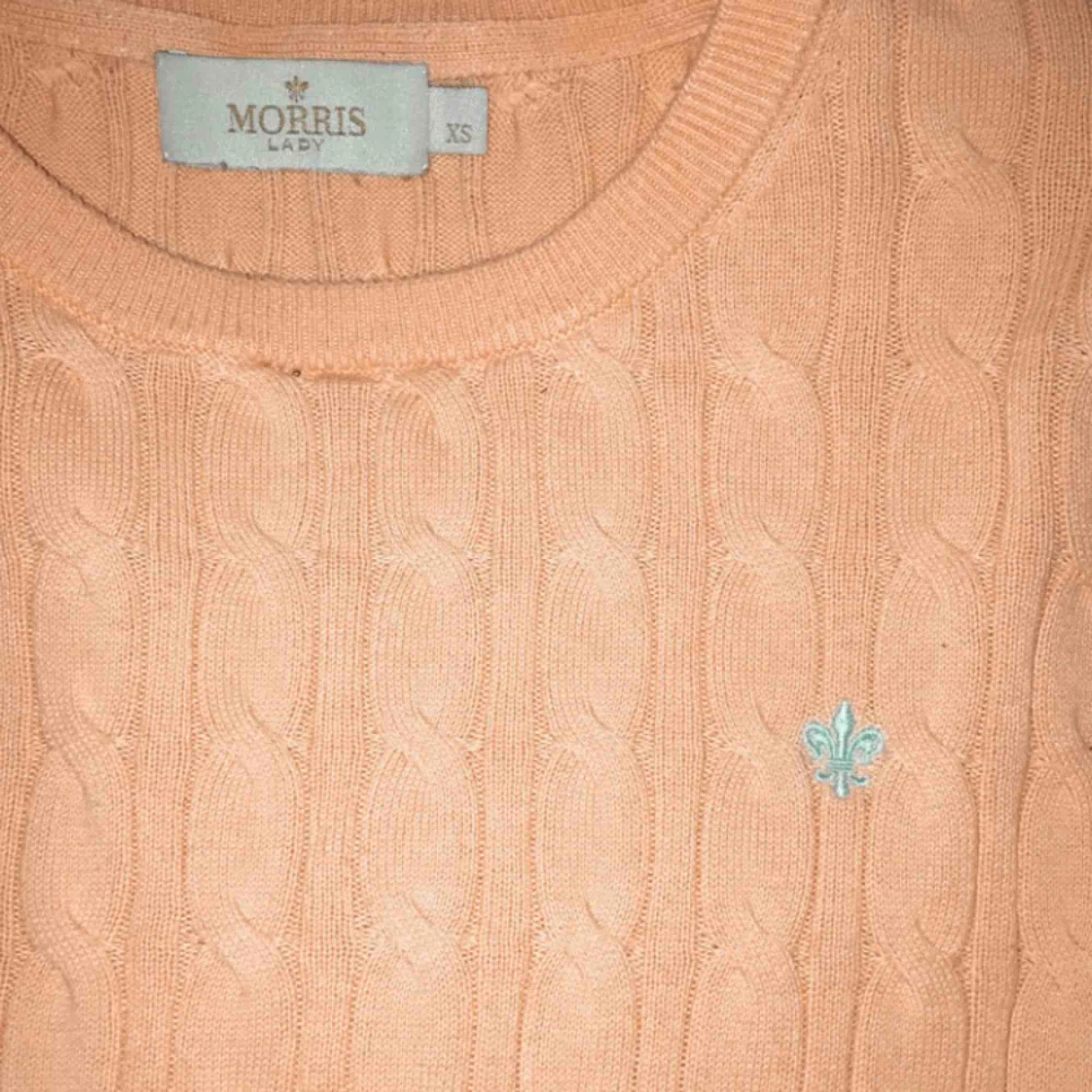 Korallrosa tröja med ljusblått inbroderat tryck från Morris. Nypris 1200kr