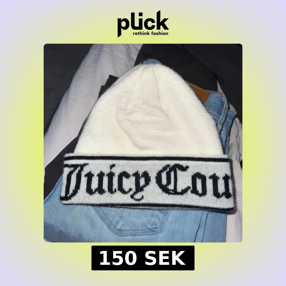 Vit stickad mössa från Juicy Couture. Klassisk form och mjukt material som håller dig varm och snygg under kalla dagar. Aldrig använd.