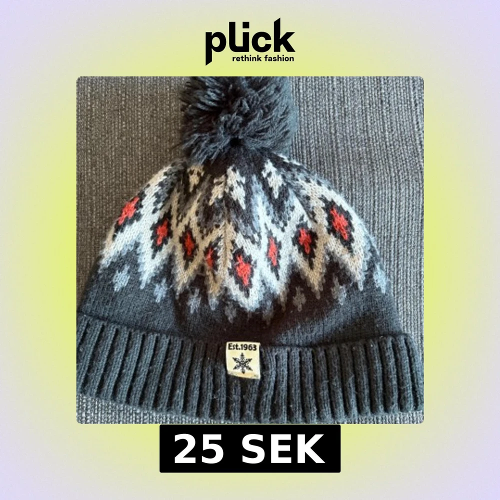 Säljer en stickad mössa från Est.1963 med stor tofs på toppen. Mössan har ett snyggt mönster i svart, grått, vitt och rött och ribbad kant. Tillverkad i 100% akryl. Använd men i bra skick och tvättad flera gånger.