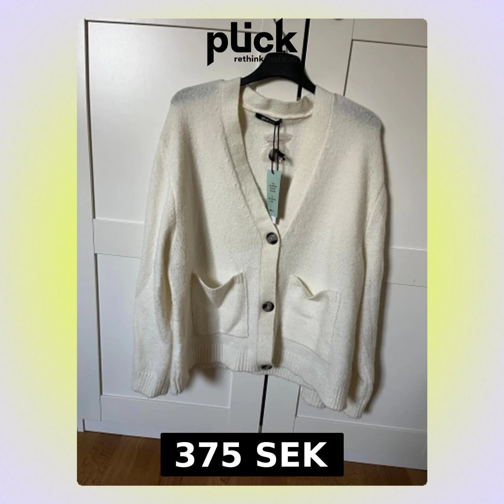 Supermysig vit stickad kofta från Gina Tricot med v-ringad hals, stora knappar och två rejäla fickor framtill. Perfekt för lager-på-lager och chill dagar. Ribbad kant nedtill och vid ärmslut för extra comfy vibe. Ny med prislapp, strl M.