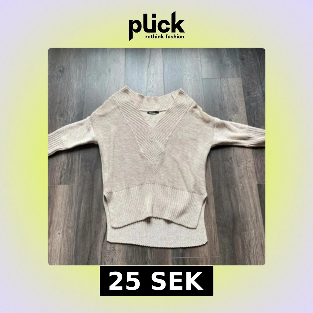 Säljer en beige stickad tröja från Gina Tricot i storlek XS. Tröjan har en djup v-ringning, ribbade muddar och en längre bakdel med slits i sidorna. Perfekt att matcha med jeans för en chill look. Supermjuk och skön passform.