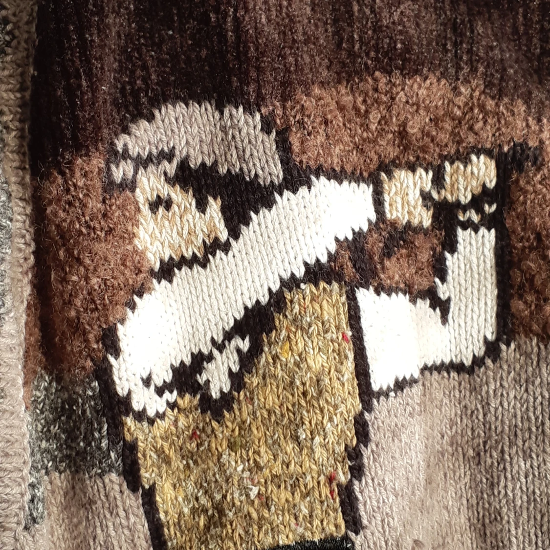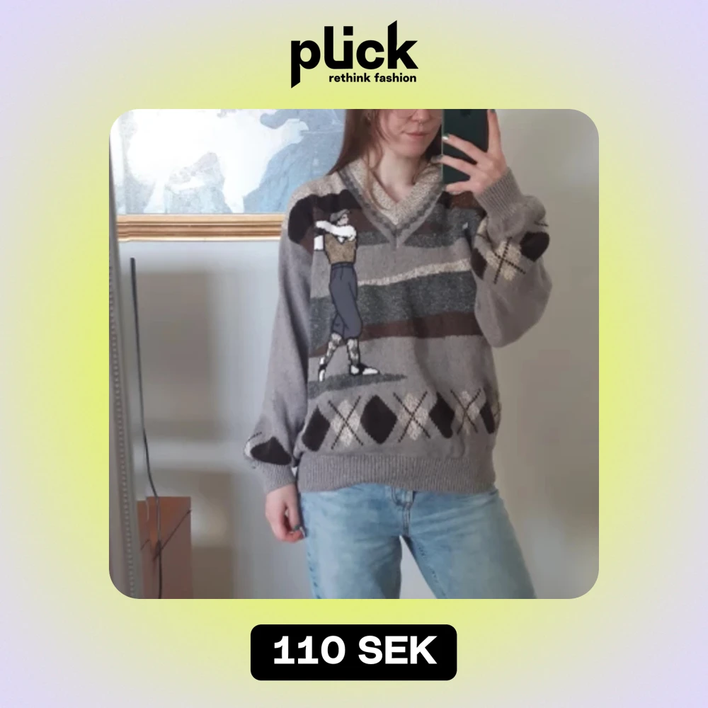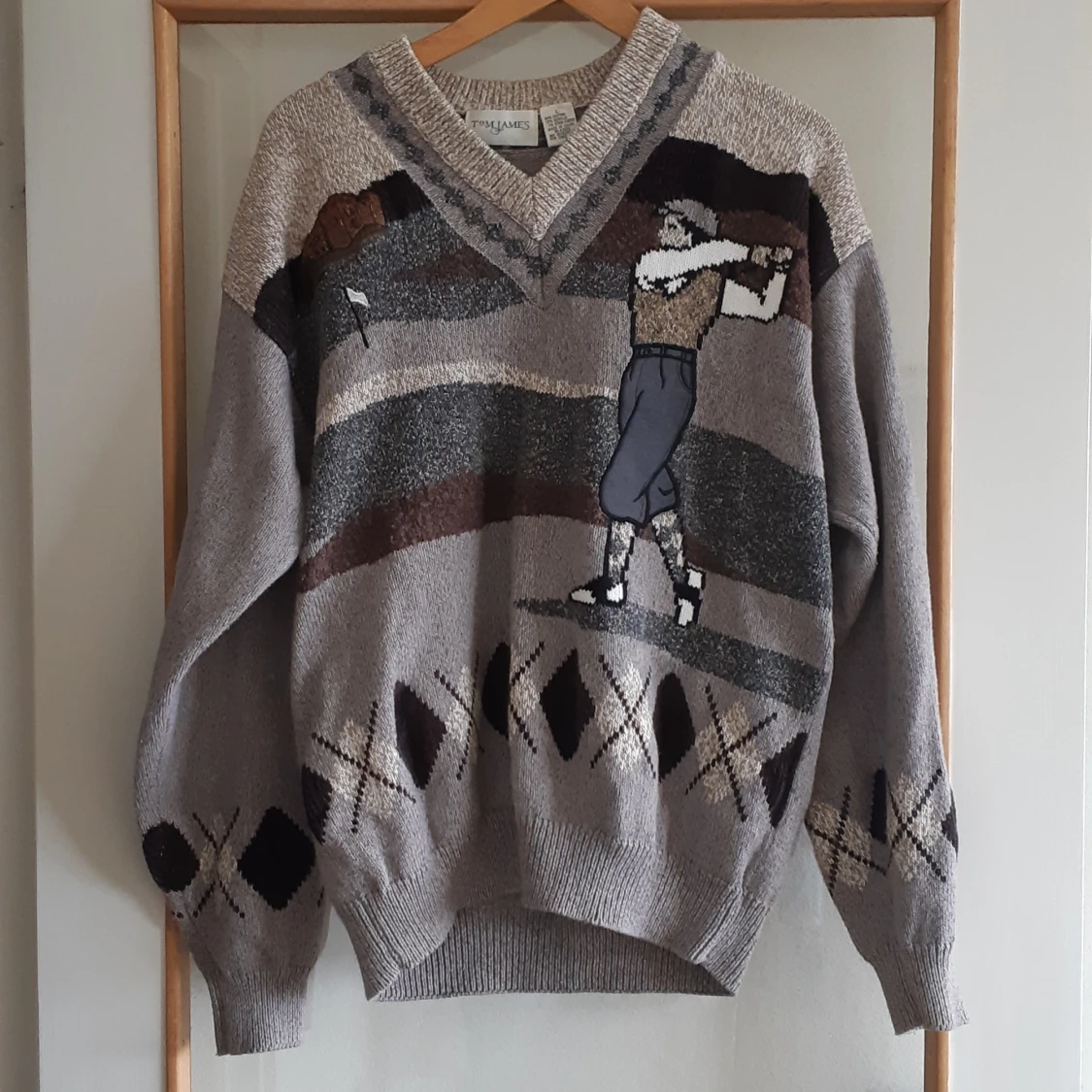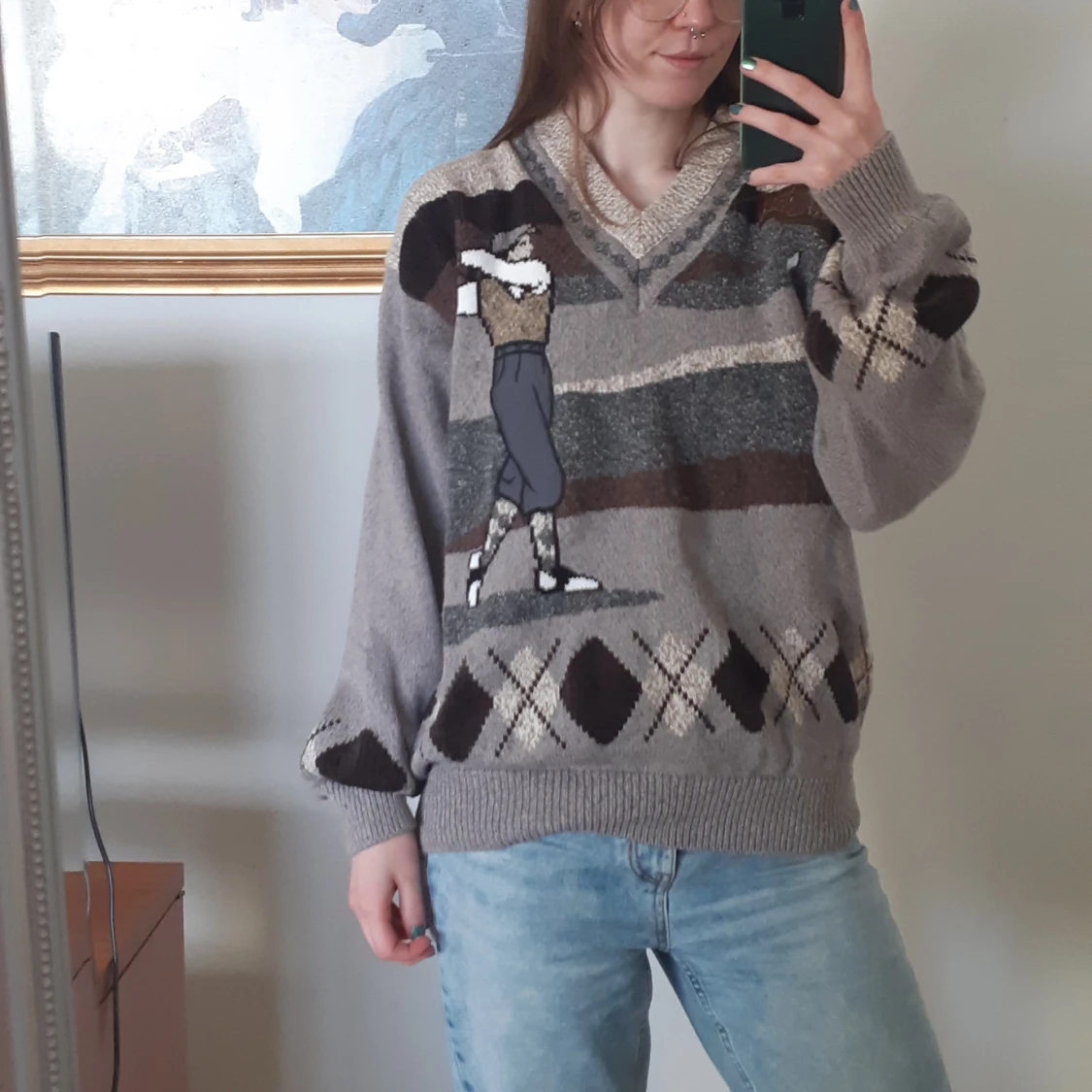 Säljer min pappas gamla stickade tröja med golfmotiv på. Väldigt härlig som oversized tröja. Säljer pga att jag inte använder den längre. Köpare står för frakt
