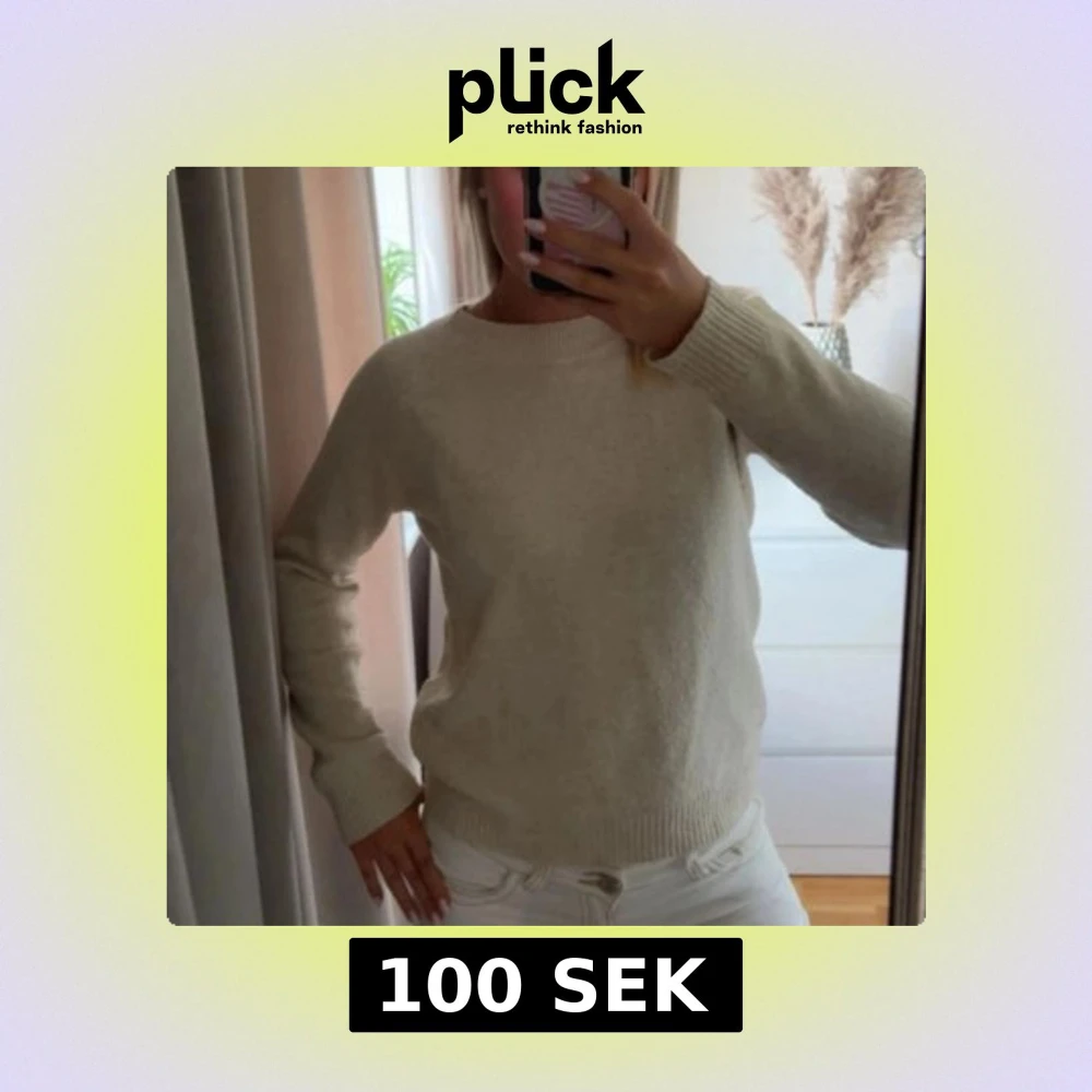 Säljer en stilren beige stickad tröja med rund hals och långa ärmar.