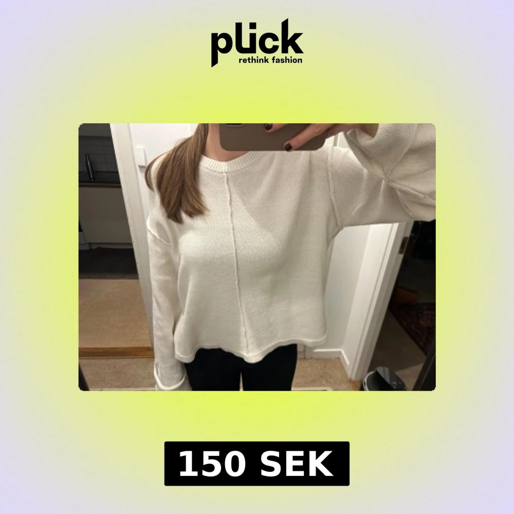 Säljer en vit stickad tröja med oversized passform och långa ärmar. Tröjan har en rund halsringning och en snygg söm som går vertikalt framtill. Mjuk och skön, perfekt för chill dagar. Passar dig som gillar en loose och avslappnad stil.