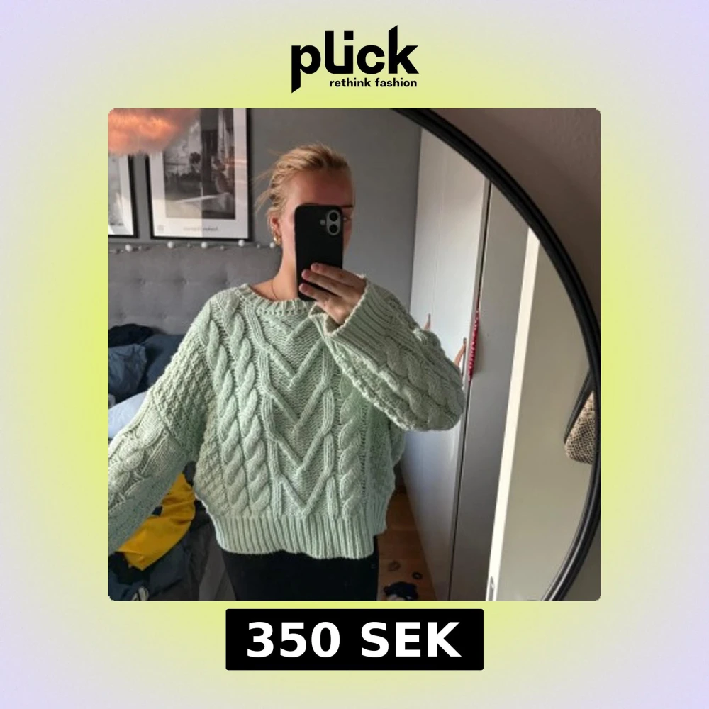 Supermysig ljusgrön stickad tröja med grovt kabelmönster och breda ribbade muddar. Tröjan har en loose passform och långa ärmar, perfekt för att chilla eller hänga med kompisar. Färgen är fräsch och ger en soft vibe till din outfit.