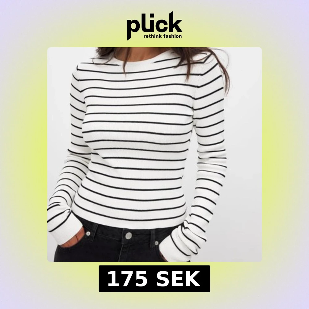 Säljer en vit långärmad tröja från NA-KD med svarta horisontella ränder. Tröjan är ribbad och har en tight passform med rund halsringning. Perfekt att styla med jeans eller kjol för en clean och fräsch look.