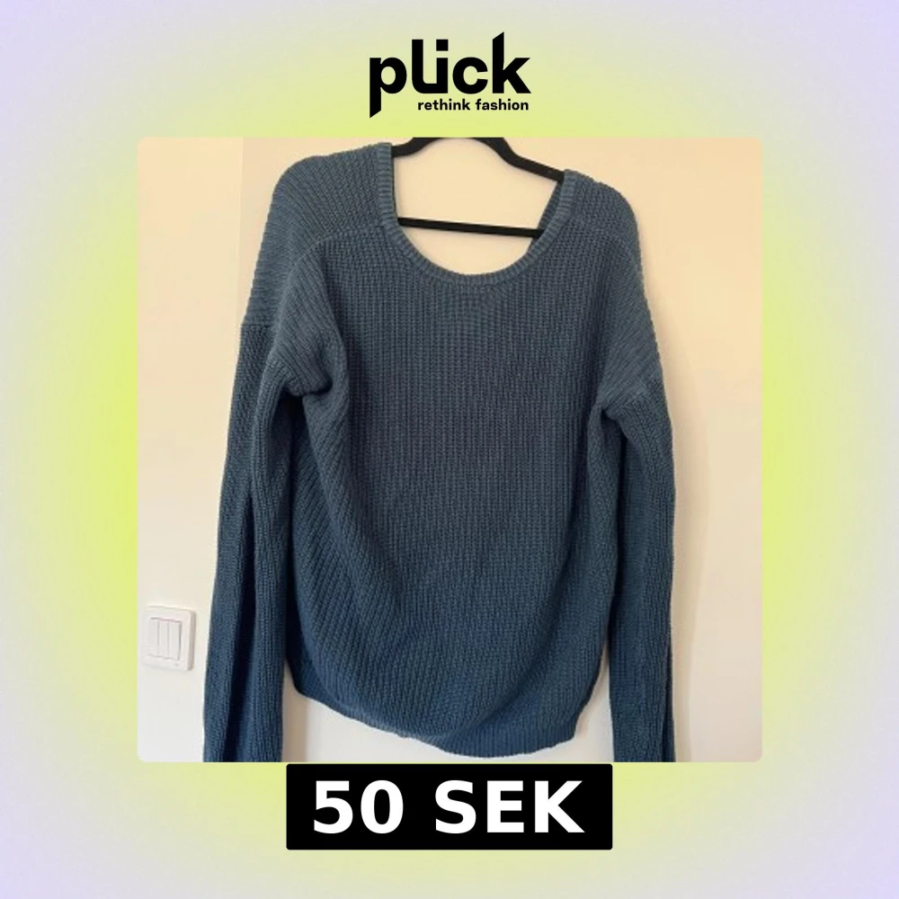 Mysig blå stickad tröja med v-ringning på ryggen och lång ärm.
