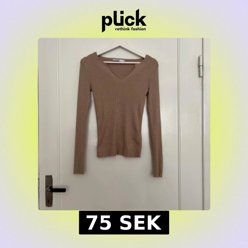 Säljer en beige ribbad långärmad tröja från NA-KD med v-ringning. Tröjan har en slim passform och är tillverkad i mjukt, stretchigt material som sitter snyggt på kroppen. Perfekt att styla med jeans eller kjol.