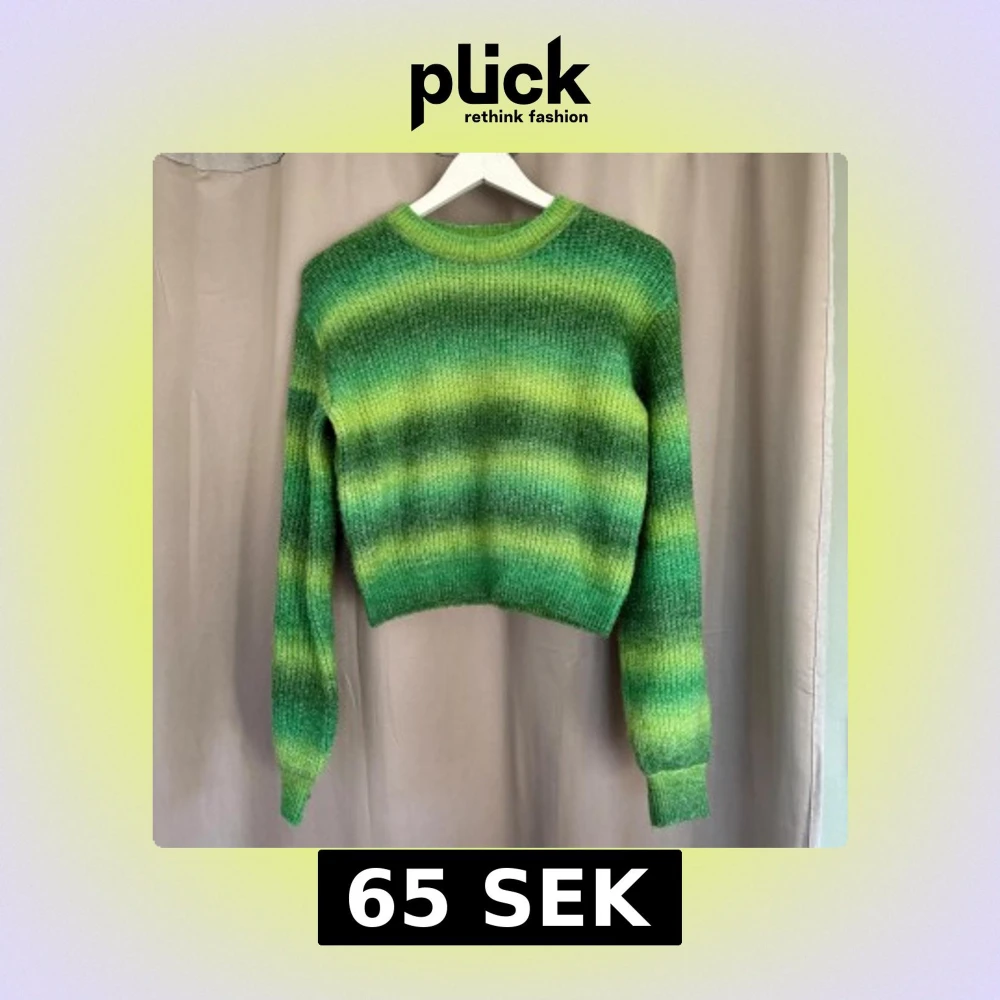 Säljer en stickad tröja från NA-KD i storlek XS med gröna ränder. Tröjan har en croppad passform, rund hals och långa ärmar. Materialet är mjukt och fluffigt, perfekt för att ge din outfit en färgklick.