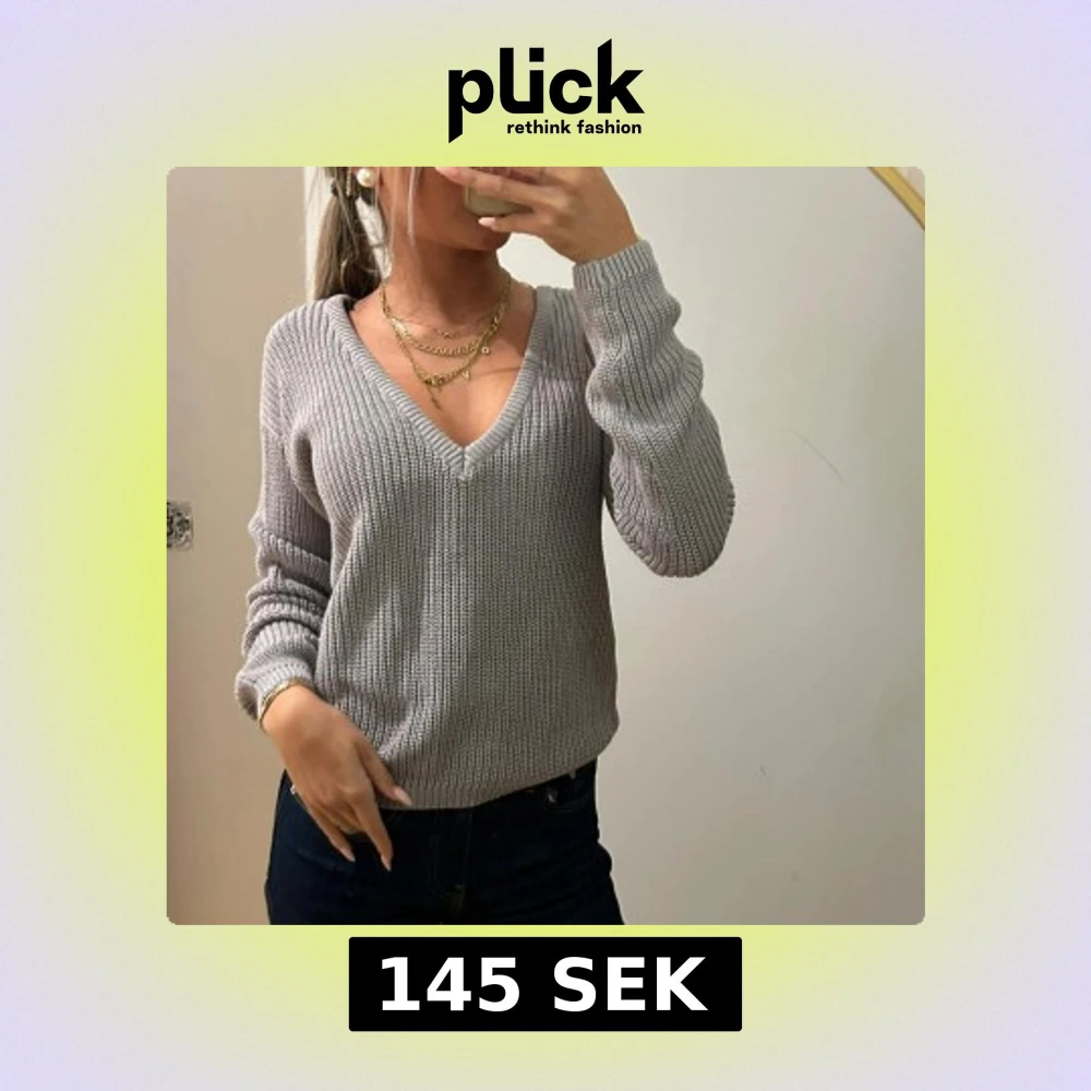 Snygg grå stickad tröja med djup v-ringning och långa ärmar. Tröjan har en ribbad struktur och kan bäras både på axlarna eller offshoulder för en chill vibe. Perfekt att matcha med jeans och smycken för en trendig look.