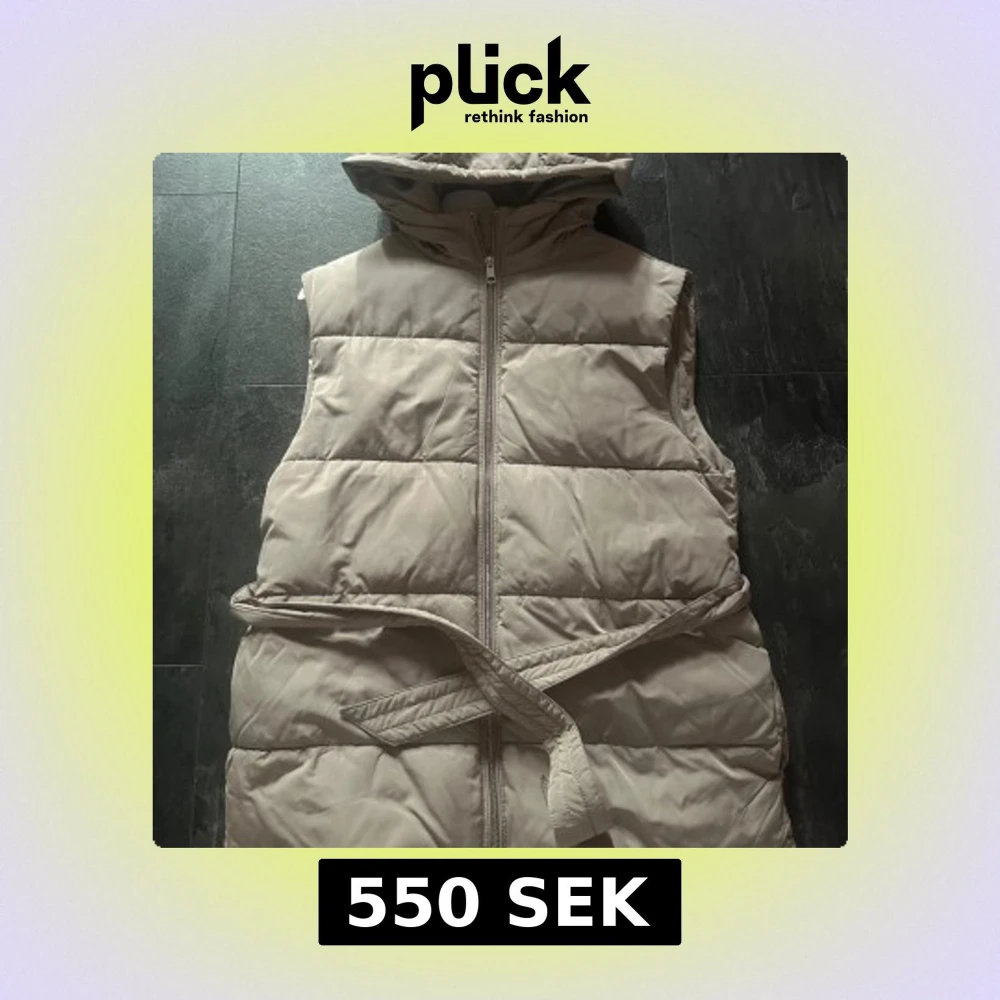 Säljer en beige quiltad dunväst från Nelly i storlek 36. Västen har huva, dragkedja framtill och ett bälte i midjan för extra snygg passform. Perfekt att slänga över en hoodie eller stickad tröja när det är kyligt ute.