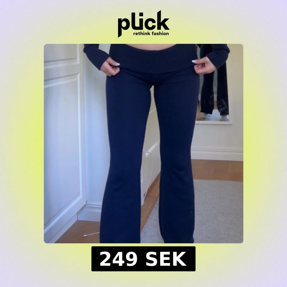 Mörkblå stickade byxor med ribbad struktur och bootcut-silhuett. Säljer även överdelen i min profil. Nypris 300 kr🩷