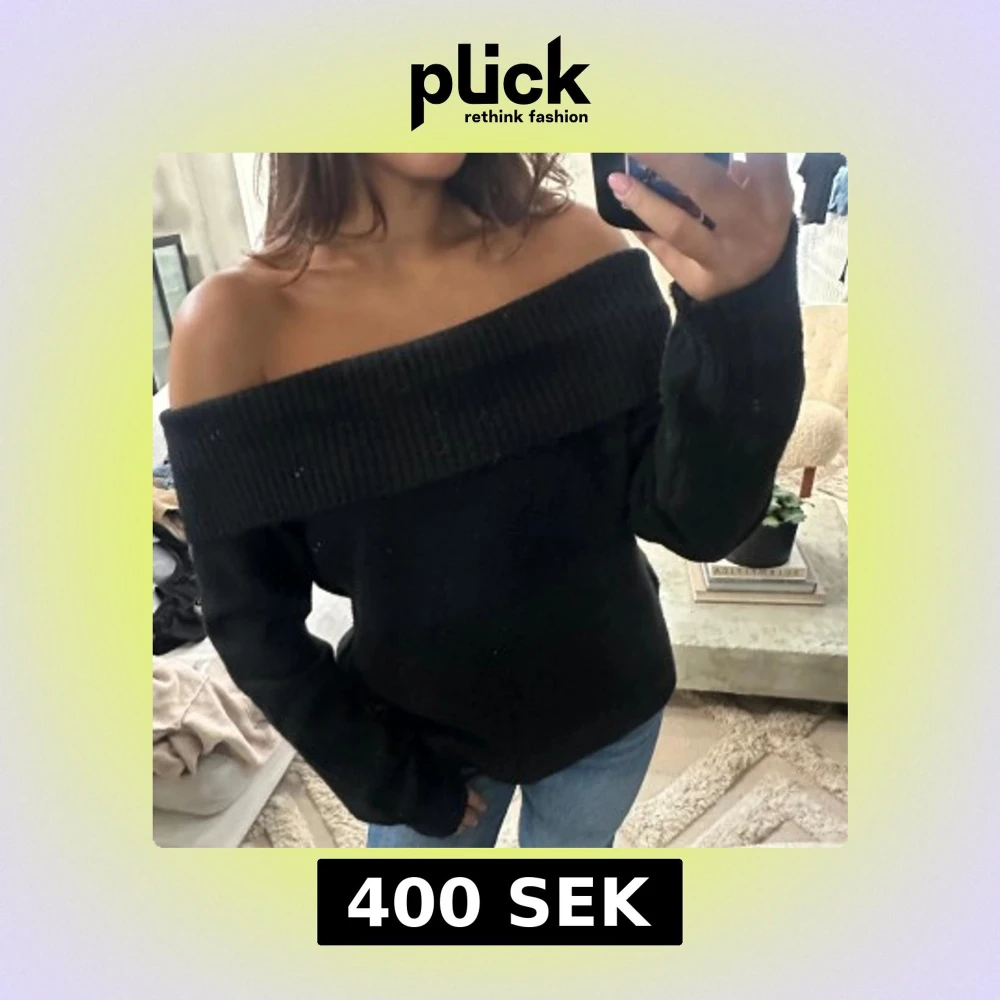 Svart stickad tröja med bred offshoulder-ringning som visar axlarna. Tröjan har långärmade ärmar och en loose passform. Jag har på mig 38 i tröjan men är i vanliga fall 34