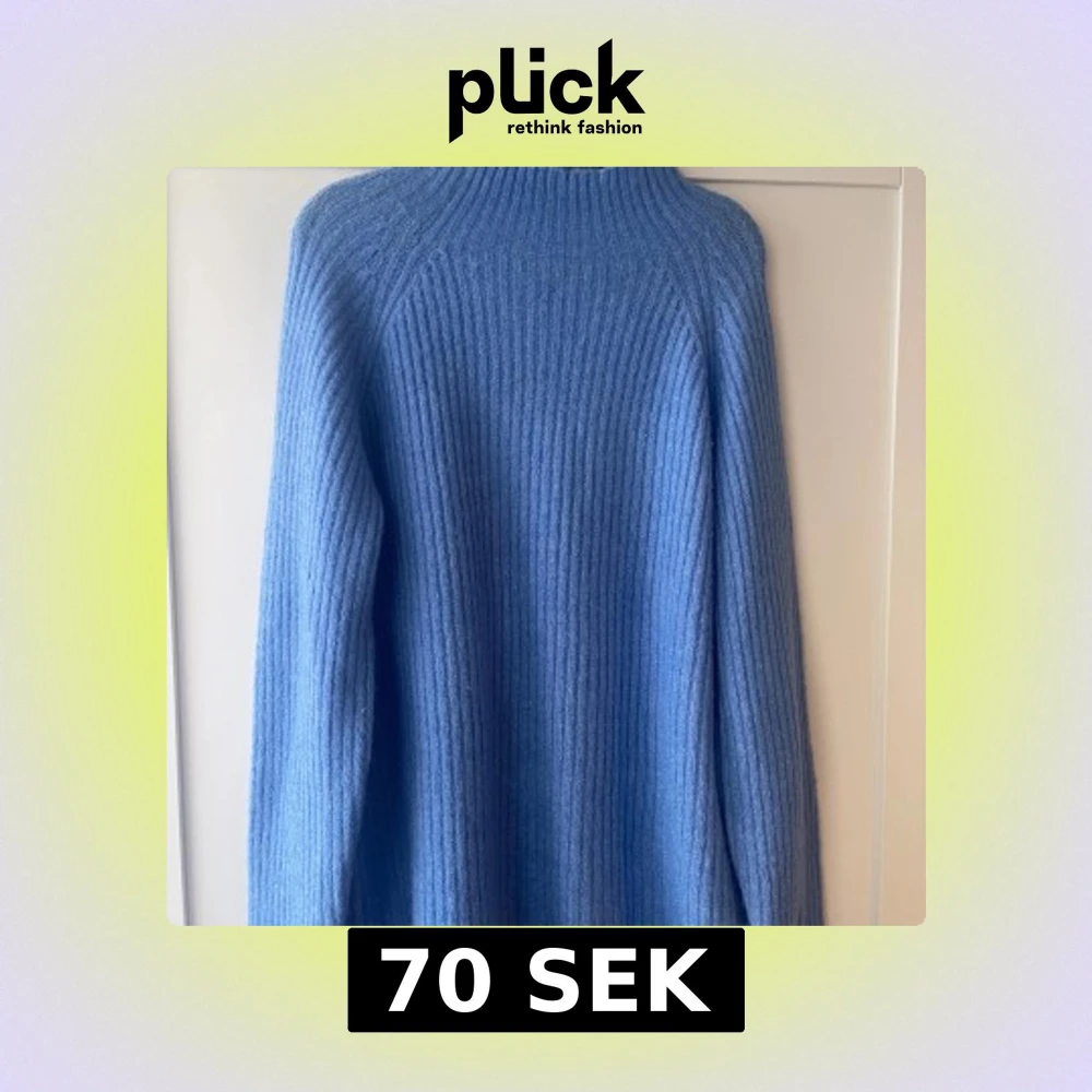 Säljer en blå ribbstickad tröja med lång ärm och hög krage. Tröjan har en klassisk, rak passform och är perfekt för kyligare dagar. Enkel och stilren design som passar till mycket.