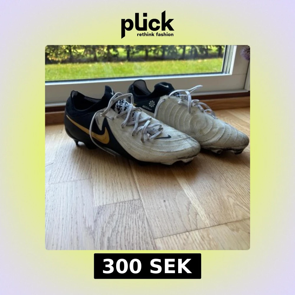 Säljer ett par Nike fotbollsskor i svart, vitt och guld. Skorna har snörning, rund tå och platt sula med dobbar för bra grepp på planen. Snyggt guldigt swoosh-märke på sidan och stickad detalj vid ankeln. Perfekta för dig som vill sticka ut på matchen.
