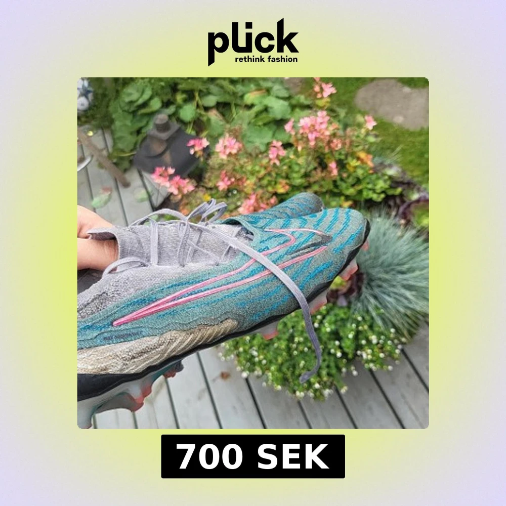 Säljer ett par Nike fotbollsskor med grå ovandel och blått mönster, samt rosa detaljer på swoosh-loggan. Skorna har snörning och stickad strumpa runt ankeln för extra komfort. Sulan har rosa och blå dobbar för bra grepp på planen. Perfekt för dig som vill sticka ut på matchen.