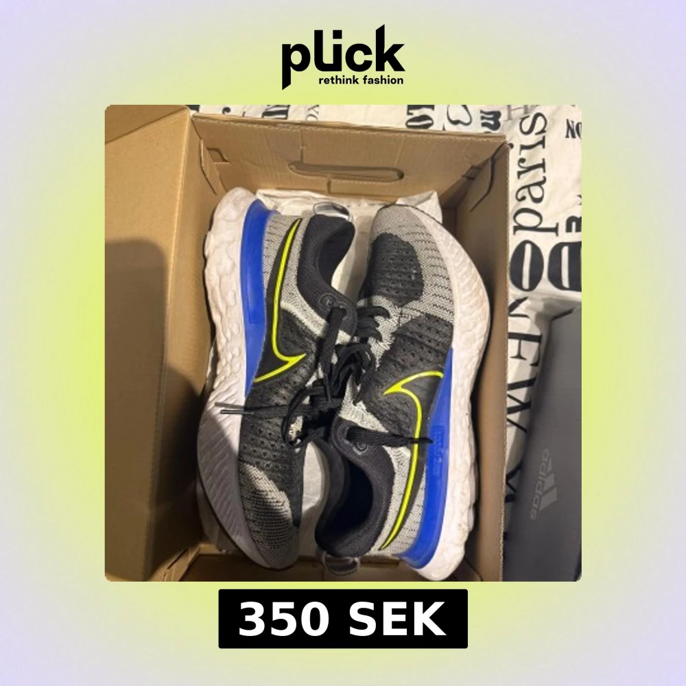 Nike React sneakers med svart och grå stickad ovandel, stora gula swoosh-detaljer och blå inslag vid sulan. Skorna har en tjock, vit och dämpad sula för extra komfort och snörning framtill. Perfekta för dig som gillar sportig och modern stil.