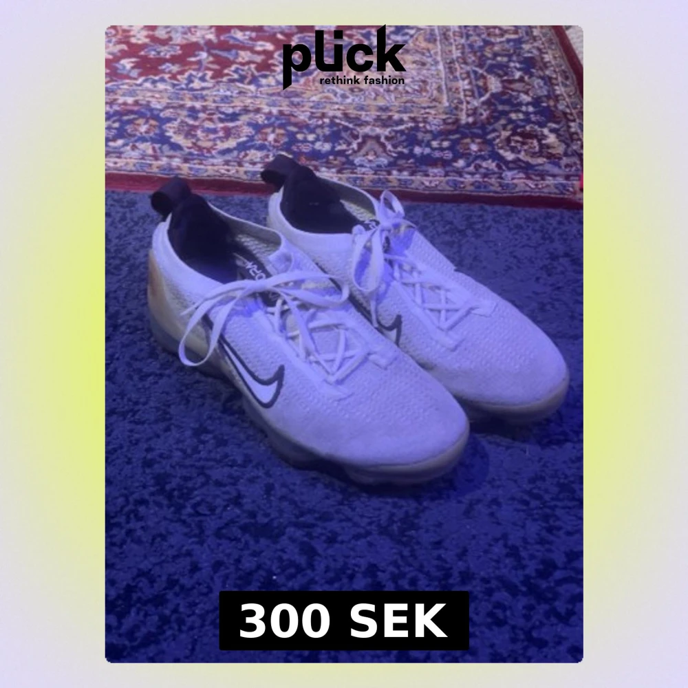 Nike Vapormax sneakers i vit färg med svart swoosh på sidan. Skorna har en stickad ovandel och genomskinlig platt sula med unik bubbeldesign. Snörning framtill och svarta detaljer vid hälen. Perfekta för dig som gillar sportig och modern stil.
