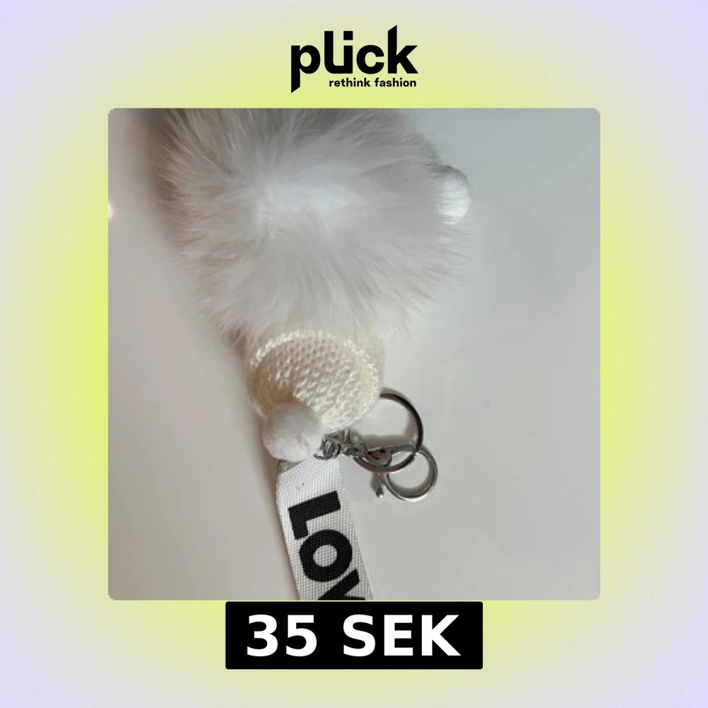 Supergullig vit väskdekoration med en sovande docka i stickad mössa och fluffig pälsboll. Nyckelring och karbinhake gör den enkel att fästa på väskan. Dekorband med texten LOVE ger extra attityd.