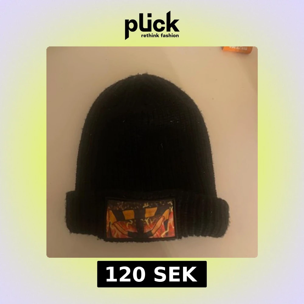 Svart ribbstickad mössa med uppvikt kant och en stor patch framtill med motiv av gula och svarta rutor, eldflammor och tecknade armar. Perfekt för dig som vill sticka ut med en cool detalj på huvudet. Materialet är mjukt och värmande.
