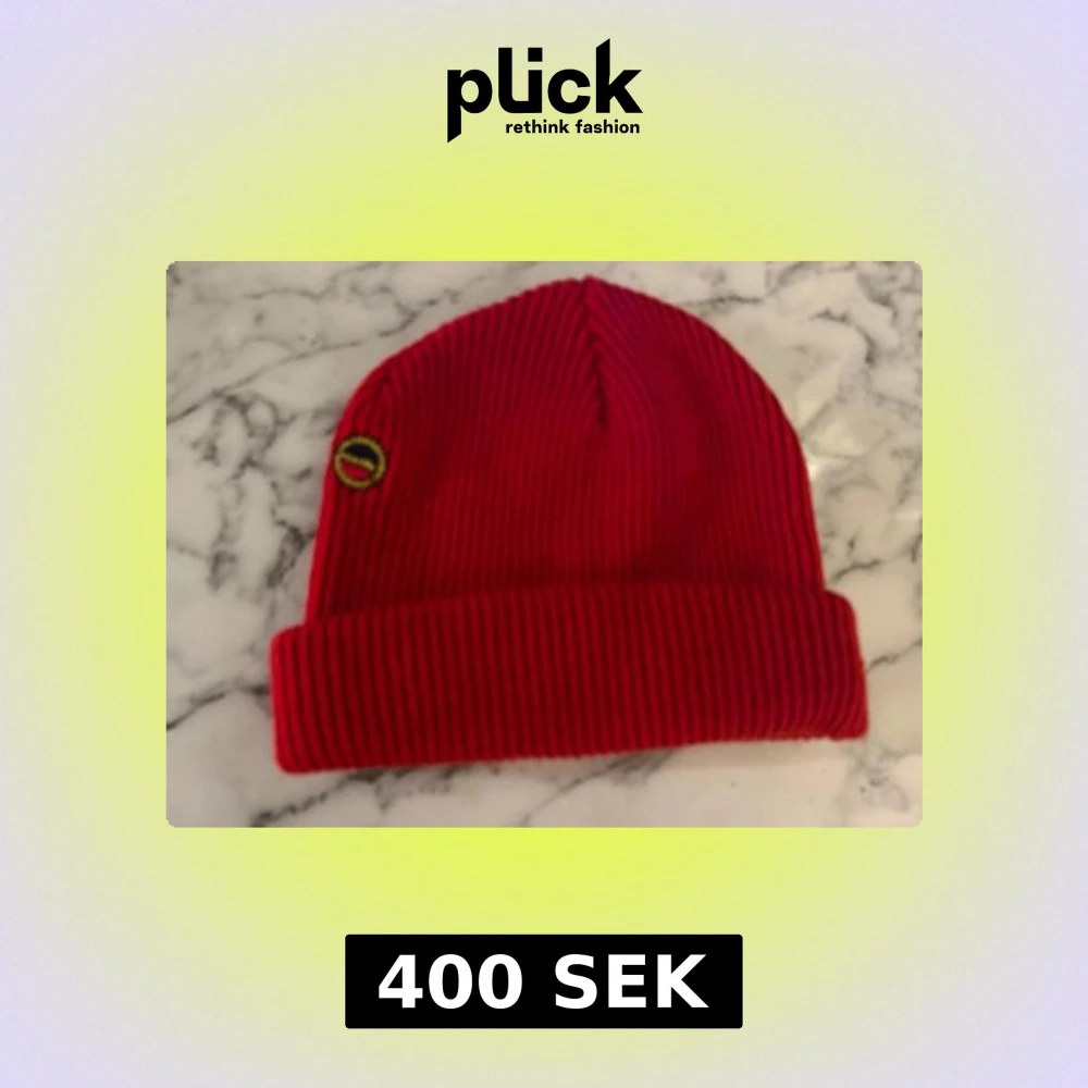 Snygg röd mössa med ribbad stickning och uppvikt kant. På sidan sitter en broderad patch i gult och svart som ger extra attityd. Perfekt för dig som vill sticka ut med färg i vinter. Materialet är mjukt och stickat, passar dig som gillar streetwear. Har tyvärr klippt bort etiketten men det är en Busnel vintage