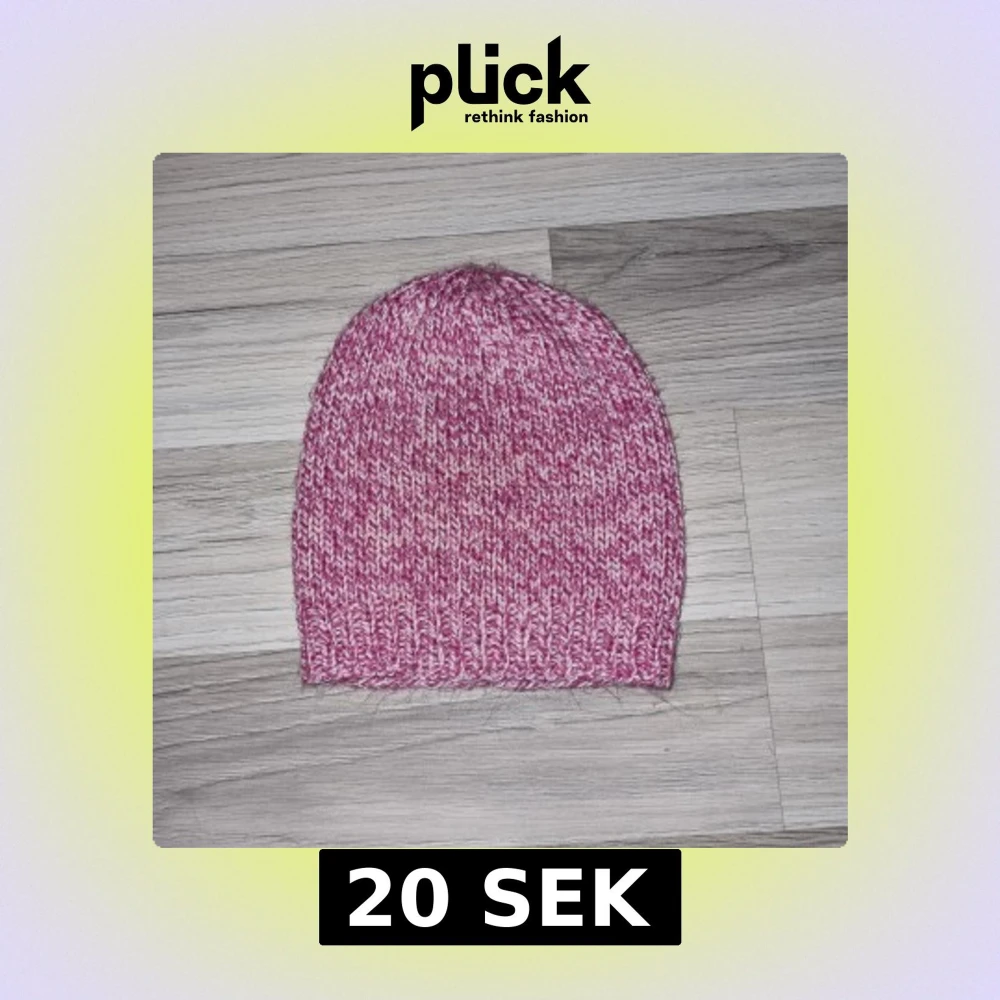 Säljer en mysig rosa stickad mössa med ribbad kant. Perfekt för kyliga dagar och ger en skön passform. Den melerade hemmastickade.