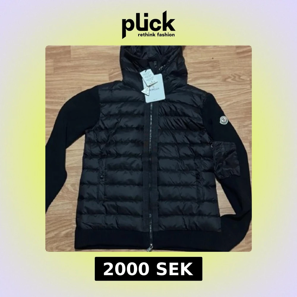 Svart pufferjacka från Moncler med huva och ribbstickade ärmar. Jackan har dragkedja framtill, quiltad kropp och Moncler-logga på ärmen. Snygg, stilren och perfekt för kyliga dagar. Materialmix av polyester och stickad textil.
