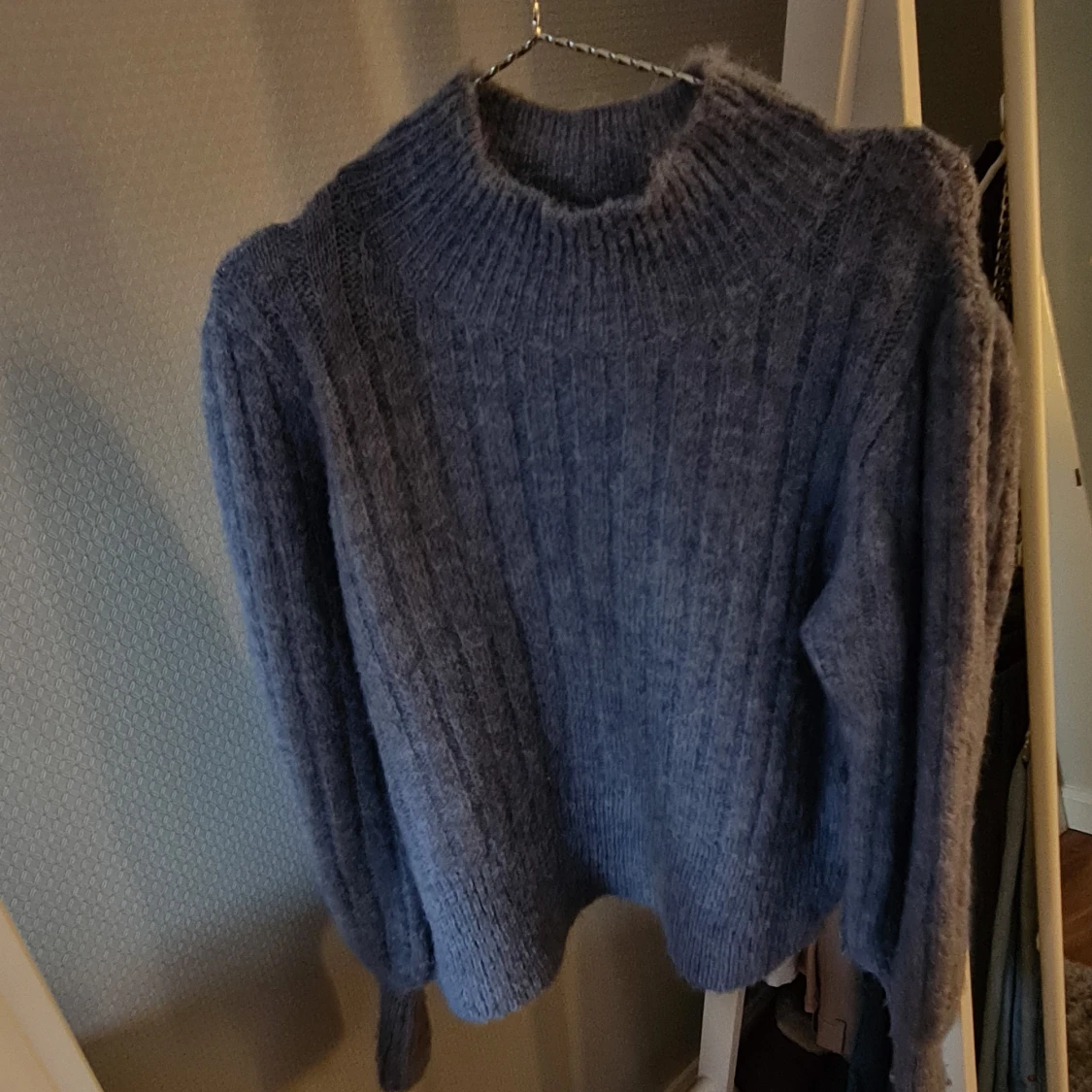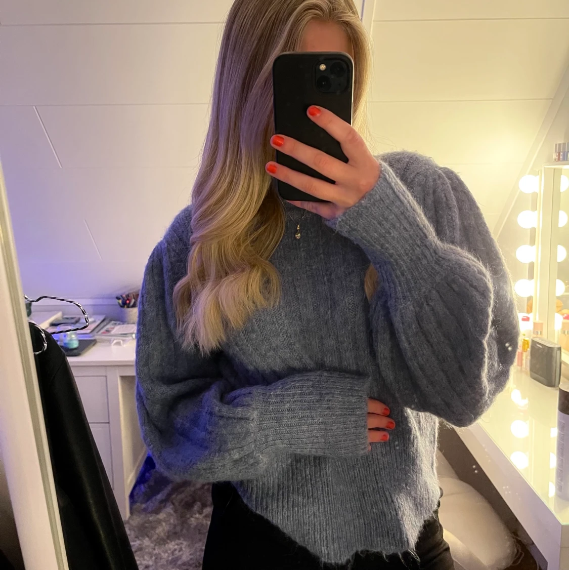 Köpte denna fina stickade tröjan för 1 år sedan från Object, den är sparsamt använd och har en jättefin blå färg. Den har lite puffigare ärmar och en medelhög krage. Den sticks inte alls och har inga defekter och passar perfekt nu till höst3n/vintern💙 (nypris 499).