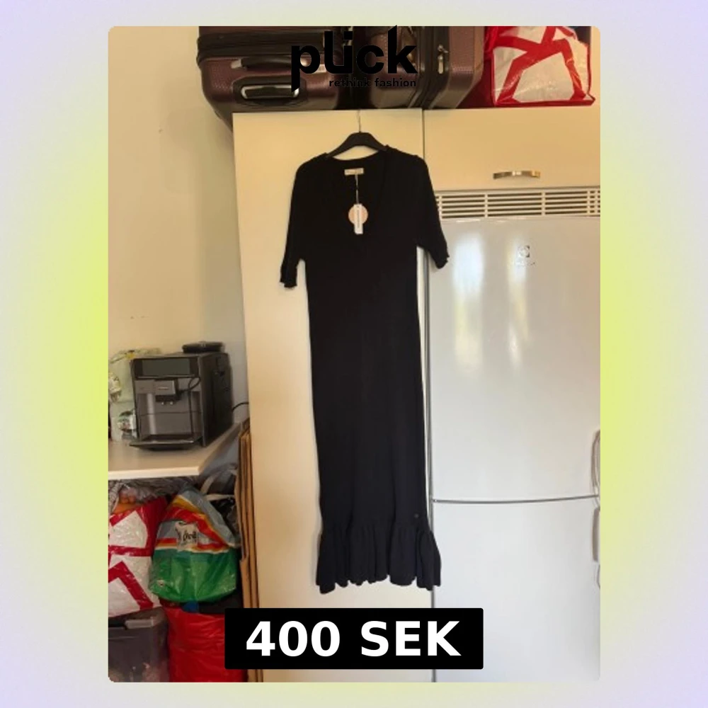Svart långklänning från Odd Molly i stickad bomull. Klänningen har v-ringning, korta ärmar och en snygg volangkant nertill. Snygg kabelstickad detalj framtill och mjuk känsla. Perfekt för dig som gillar stilrena och bekväma plagg. Storlek 1 som enligt deras storleksguide motsvarar en S men ör mer en XL. Helt ny med tags/ prislapp fortfarande kvar.