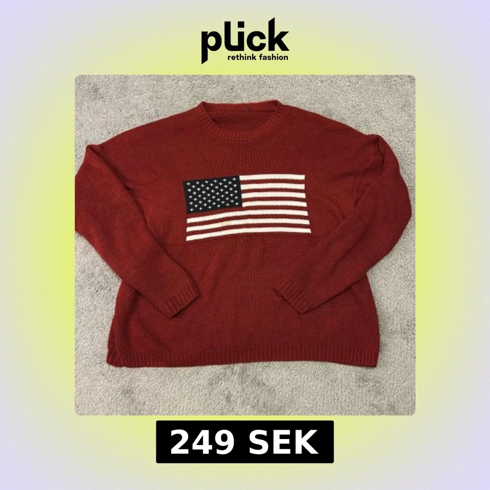 Säljer en röd stickad tröja med en stor amerikansk flagga på framsidan. Tröjan har långa ärmar och en rund halsringning. Perfekt för en avslappnad stil.
