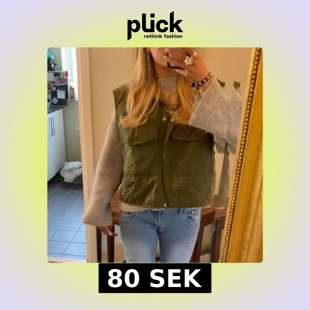 Snygg olivgrön dunväst med två stora bröstfickor och tryckknappar framtill. Västen har en boxig passform och är perfekt att slänga över en stickad tröja. Enkel och stilren design som ger en cool touch till din outfit.