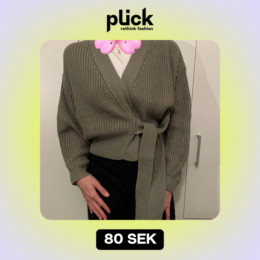 Säljer en superfin olivgrön stickad omlottkofta med knytband i midjan. Perfekt för höst och vår! Den har långa ärmar och en mysig, ribbad struktur. Passar både till vardags och lite finare tillfällen. 🧶💚
