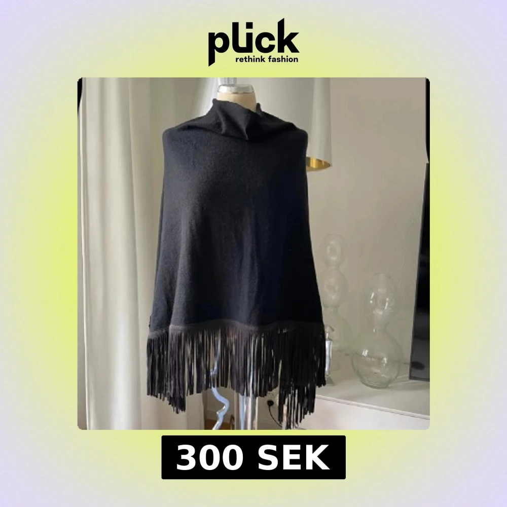 Svart poncho från Tiramisu med snygga fransar längs nederkanten. Ponchon har en lös passform och är tillverkad i ett mjukt stickat material, perfekt att slänga över sig när det är kyligt ute.