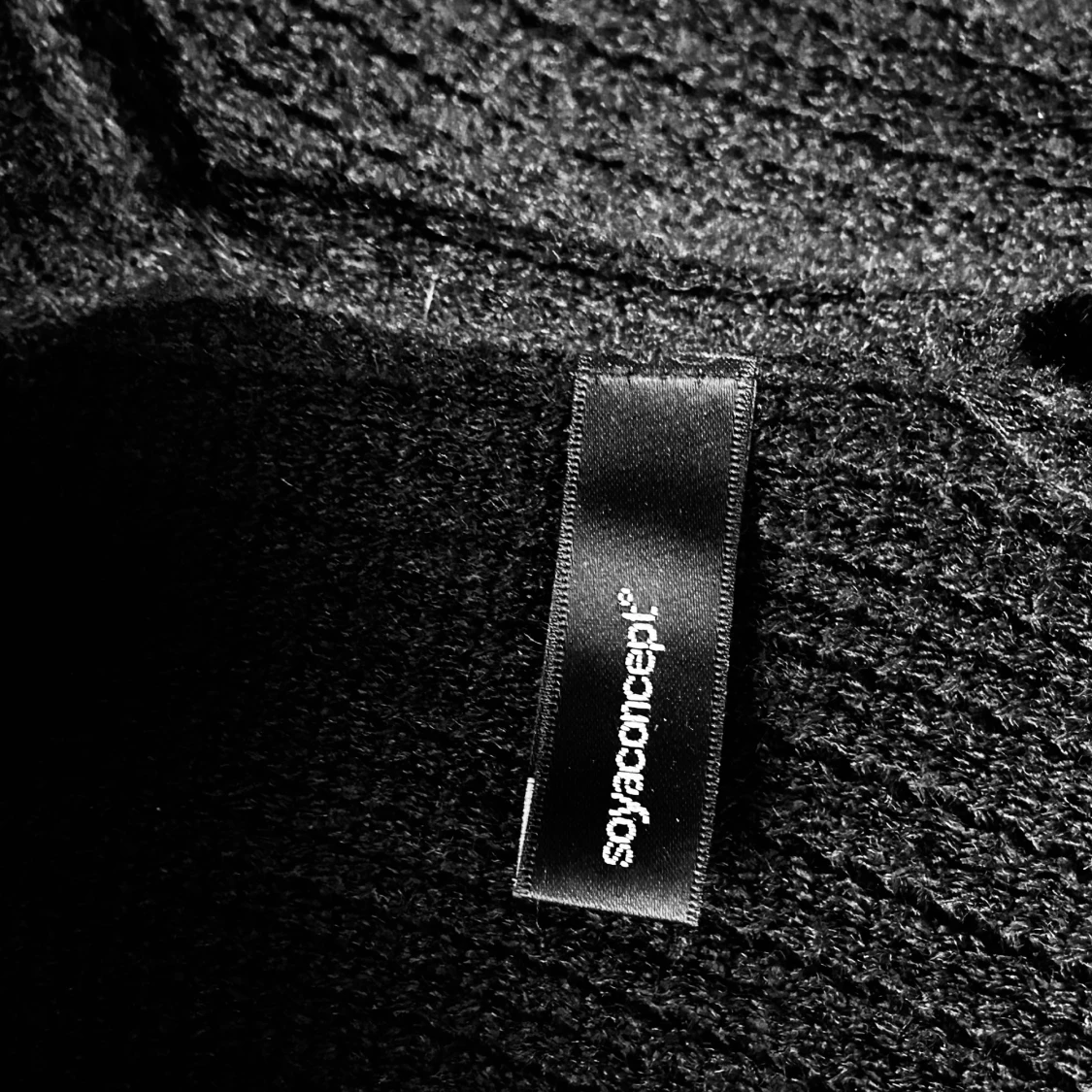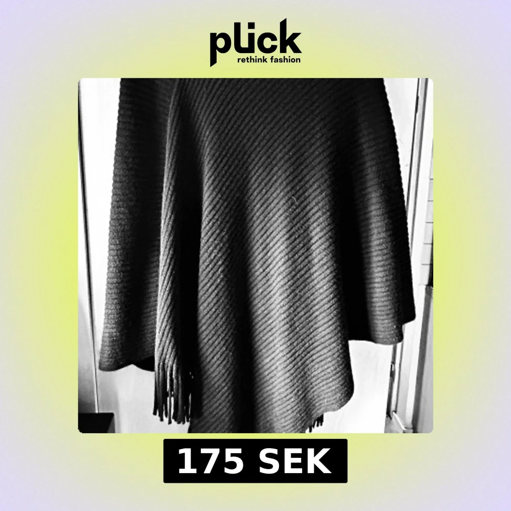 Svart finstickad poncho med stor krage och fransar från Soyaconcept. Längd från axel till längsta del 100 cm. I mycket fint skick!