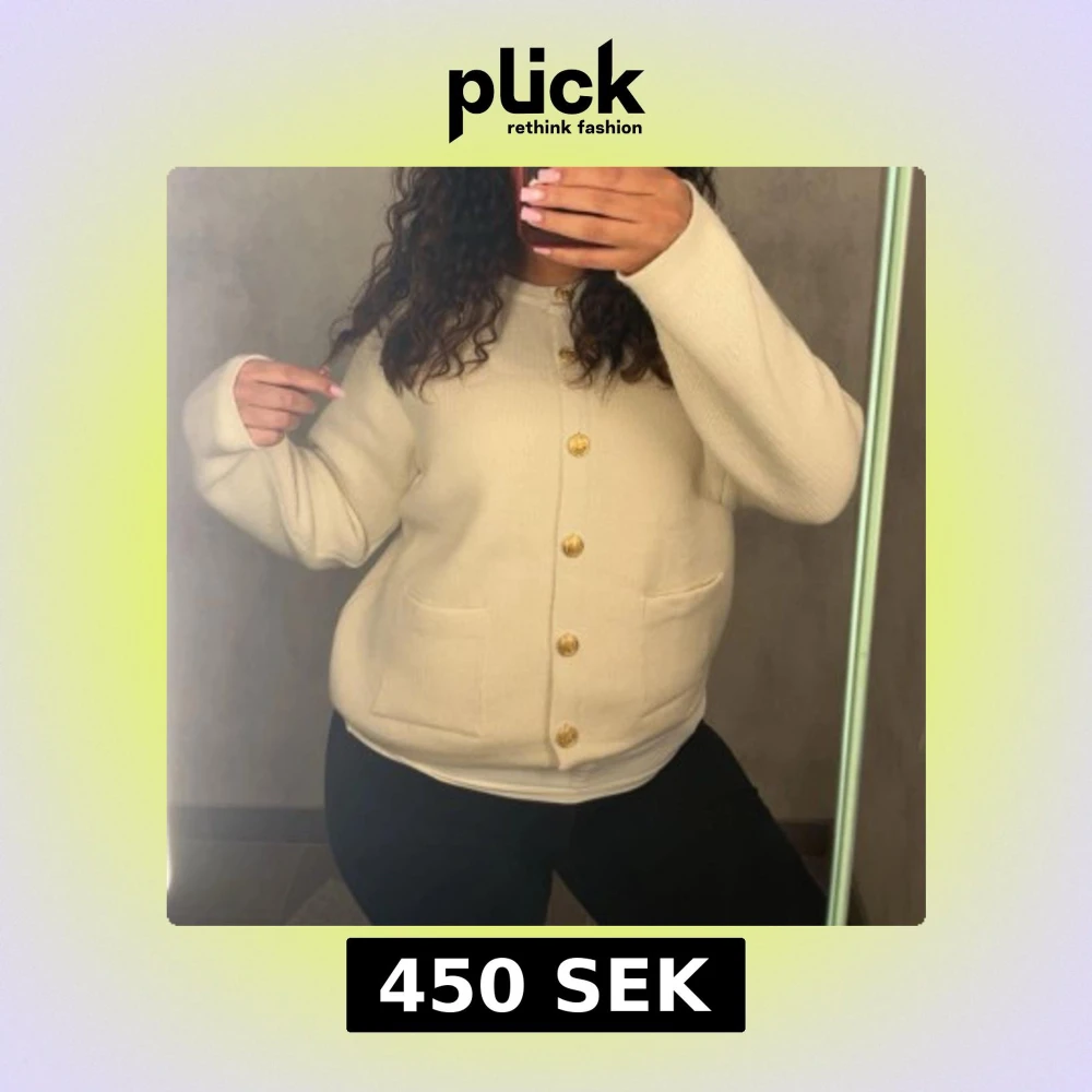 Säljer en beige kofta med snygga guldknappar framtill och två praktiska fickor. Koftan har långärmad design och är tillverkad i ett stickat material som känns mjukt och skönt. Perfekt för dig som gillar klassisk och clean stil.